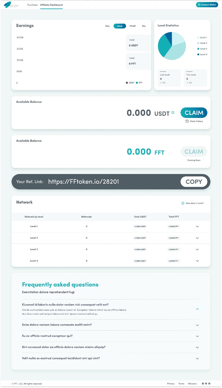 Affiliate Weboffice with 4 Levels: We developed a four-level affiliate web office platform that allows users to join through invitations. This platform's automated distribution system rewards users in USDT and FFT tokens following their purchases.